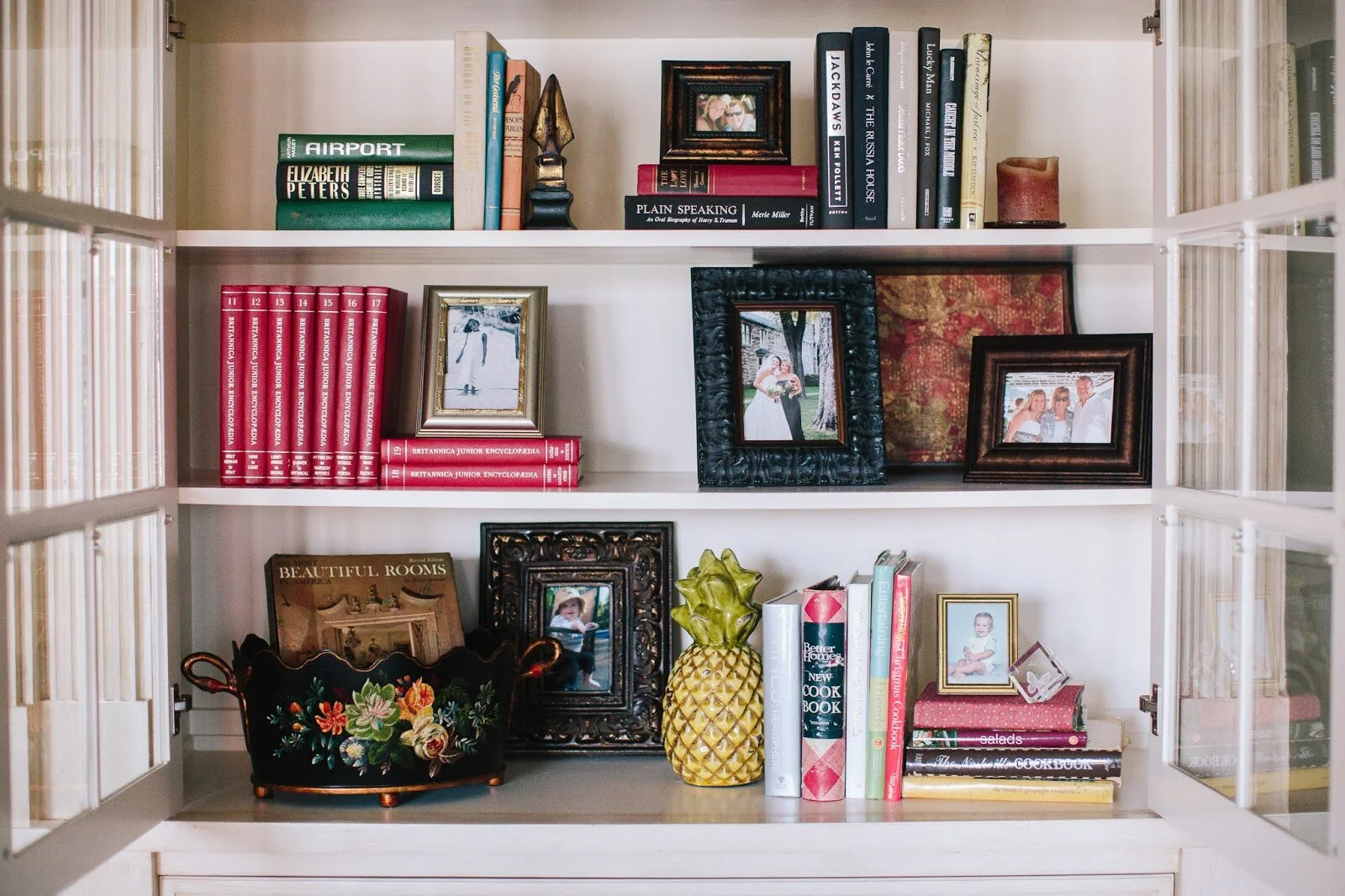 No one wants naked shelves, right?? First, less is more. ALWAYS. Negative space is important, so don’t junk up your shelves with lots of tchotchkes! If you’re going to add items, make sure they’re meaningful to you or they’ll just collect dust.